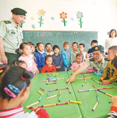 山东滨州边防支队冯家边防派出所官兵走进辖区幼儿园,对孩子们进行爱国主义教育。