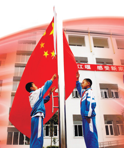 四川都江堰市绿地土桥小学学生在举行升旗仪式。