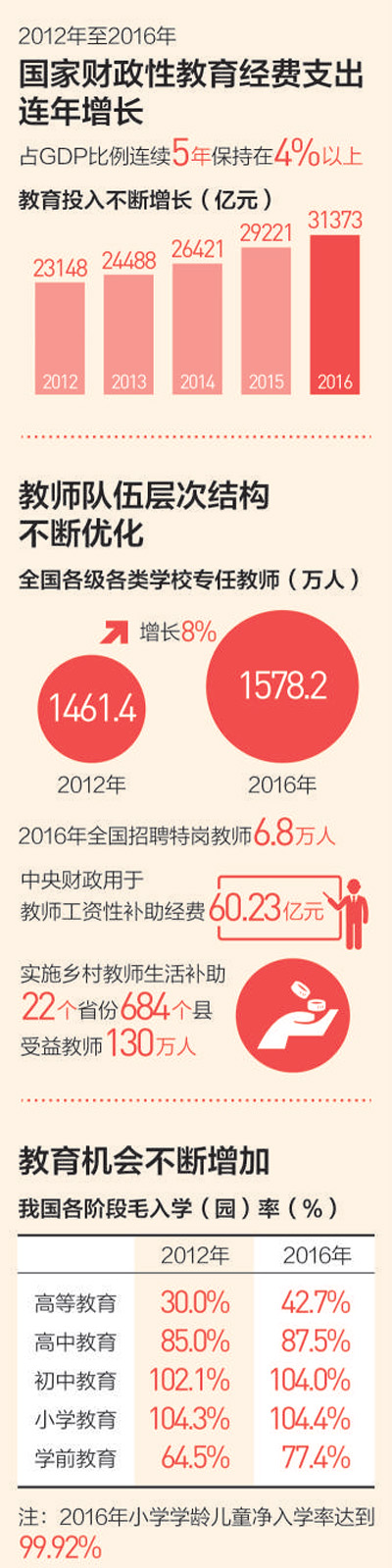 推动城乡义务教育一体化发展,高度重视农村义务教育,办好学前教育、特殊教育和网络教育,普及高中阶段教育,努力让每个孩子都能享有公平而有质量的教育
