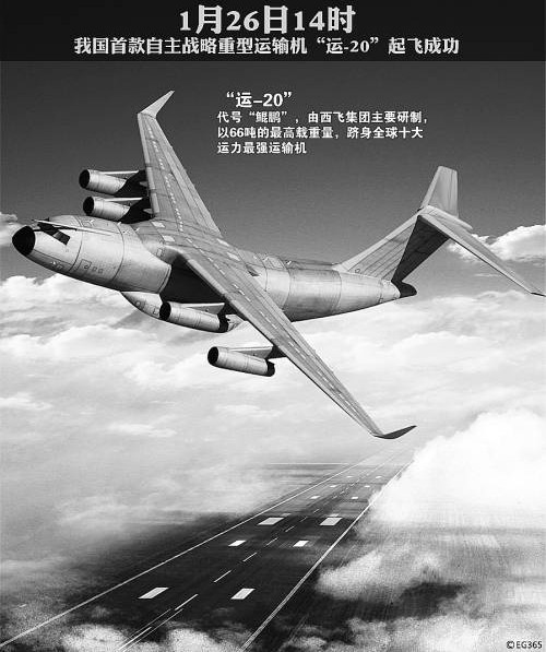 2013年1月26日,我国自行研发的大型多用途运输机运-20“鲲鹏”在陕西阎良首飞成功。这种载重量约为60吨的新一代重型军用运输机,具有非常合理的气动外形设计。这次首飞,使我国成为继美国、俄罗斯之后,第三个有能力研制大型运输机的国家。