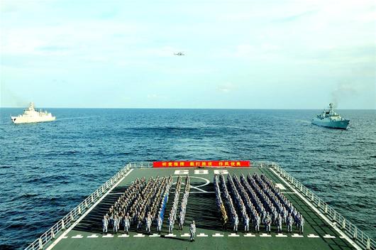 图为:26日,南海舰队远海训练编队在曾母暗沙海域举行宣誓仪式。 (新华社发)