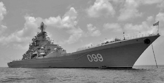 据了解,执行护航任务的俄方军舰为重型核动力导弹巡洋舰彼得大帝号(左上图),是目前世界上吨位最大的非航空母舰水面战斗舰艇,也是世界上唯一一艘现役的非航空母舰核动力水面舰艇。现为俄罗斯北方舰队旗舰。基本参数为:舰长250.1米,舷宽28.5米,吃水10.3米,高度59米,排水量23,750吨(标准)、25,860吨(满载),乘员635名自持力60天,航速32节。舰载武装主要有:舰炮1×双联装AK-130 DP多用途双管舰炮,导弹1×20联装P-700格兰尼特远程反舰导弹系统,反潜1×10联装RBU-12000反潜火箭深弹,2座5联装533毫米鱼雷发射管,舰载机3×卡-27直升机等。