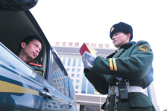 武警湖北总队机关警卫哨位正在检查出入车辆证件。谢定安摄