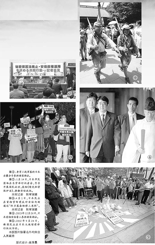 目前,日本国内的政治气候逐渐向参拜靖国神社“合理化”的方向发展。2013年12月,安倍晋三不顾国际社会的强烈反对,悍然以首相身份参拜供奉甲级战犯的靖国神社。今年4月,安倍又以首相身份向靖国神社供奉祭品,紧随其后,140多名跨党派国会议员集体“拜鬼”。安倍晋三在其著述《致美丽的祖国》中妄称,参拜靖国神社“目的是向为我们国家献出生命的人表达尊崇的心情”。他还质疑“东京审判”的法理依据,狡辩称“战犯在国内法上不是罪犯”,所谓“‘甲级战犯’存在着误解”。 日本政府审定通过否认殖民及军国主义侵略罪行的历史教科书误导日本新生代。右翼团体“新日本历史教科书编撰会”肆意歪曲历史,鼓吹殖民及军国主义侵略有理。日本政府借口该历史教科书是由民间学者编撰,极力淡化日本中小学教科书均须交文部科学省审定的责任,并以“学习指导要领”解说书的形式,纵容“新历史教科书编撰会”肆意歪曲历史事实。