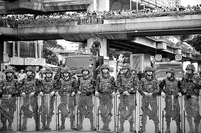 5月26日,泰国士兵在曼谷胜利纪念碑附近警戒。新华社发
