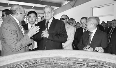 埃及临时政府总理马赫莱卜(左三)在中国援建的苏伊士运河大学渔业与水产教学培训中心视察时,听取情况介绍。