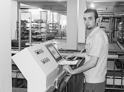 中埃苏伊士经贸合作区内,巨石集团埃及公司年产8万吨玻璃纤维。图为生产线上的埃及技术员。