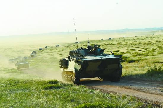 6月18日,“跨越-2014·朱日和”系列演习第二场实兵对抗在北京军区朱日和训练基地落下帷幕。截至目前,扮演红军的南京军区某装甲旅、广州军区某机步旅已经完成对抗演练,而即将登场的济南军区某机步旅已千里机动至草原腹地,他们正“摩拳擦掌”、“箭在弦上”,第三场“恶战”一触即发。