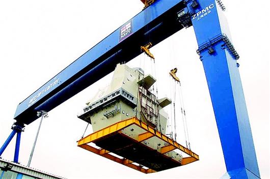 “女王”号航母采用的是分段模块化建造方法,先由单个船厂建造航母分段或大型部件,最后再运输到船坞进行组装。在整个航母的建造过程中,中国桥吊担负起了吊装航母的中流砥柱的作用,舰岛、球鼻艏、滑跃甲板这些大型部件的吊装工作,均是使用这门中国桥吊完成,可谓是立下了“汗马功劳”。