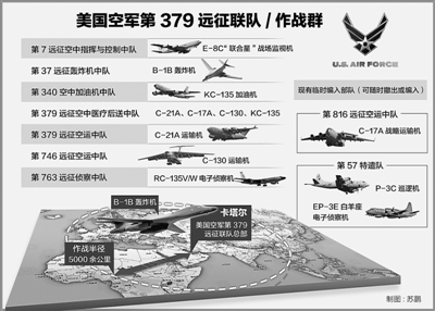 《美国空军2013财年国防授权法执行计划:一支面向未来的强大整体部队》(简称《计划》)提出:未来美国空军将专注于完成五大“核心任务”——保持空天优势,全球打击,全球快速机动、情报、监视和侦察,全球指挥和控制并提供全球力量,全球到达和全球警戒。根据《计划》要求,美空军每个一级司令部对所属部队进行了重新编组与优化。作为美空军中具备远程打击与快速行动能力的典型部队,驻扎中东的第379远征联队代表着美空军发展的一个重要趋势。
