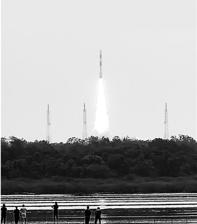 图⑥:2014年6月30日,PSLV—C23火箭从印度安得拉邦斯里赫里戈达岛的发射基地升空。新华社发