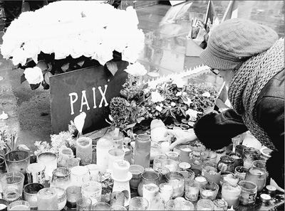 1月7日,巴黎《沙尔利周刊》恐怖袭击一周年之际,巴黎市民在共和国广场玛丽安娜塑像前向遇难者献上蜡烛,寄托哀思。本报记者 李永群摄