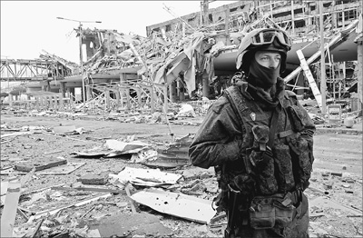 顿涅茨克机场曾是乌克兰第二大国际机场,自东部战事爆发以来,该机场一直是乌政府军与当地民兵武装激烈争夺的战略要冲。2015年4月4日,一名当地民兵武装士兵站在被炸毁的机场航站楼前。 新华社发