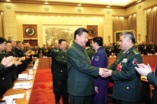 3月13日下午,中共中央总书记、国家主席、中央军委主席习近平出席十二届全国人大四次会议解放军代表团全体会议并发表重要讲话。这是习近平同军队人大代表亲切握手。