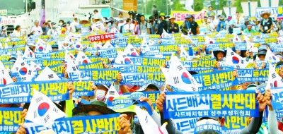 7月21日,在韩国首尔火车站广场,星州郡民众在集会上高举韩国国旗和反对部署“萨德”系统的标语。当日,两千余名“萨德”系统部署地星州郡的民众在首尔火车站广场举行集会,反对部署“萨德”系统。新华社记者 姚琪琳摄