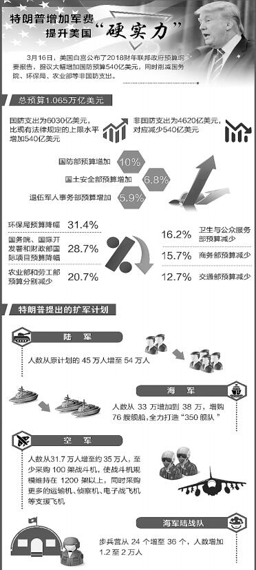 2017年3月16日,美国白宫公布了2018财年联邦政府预算纲要报告,提议大幅增加国防预算540亿美元,同时削减国务院、环保局、农业部等非国防支出,希望在不扩大财政赤字的前提下增强美国国防安全和“硬实力”。