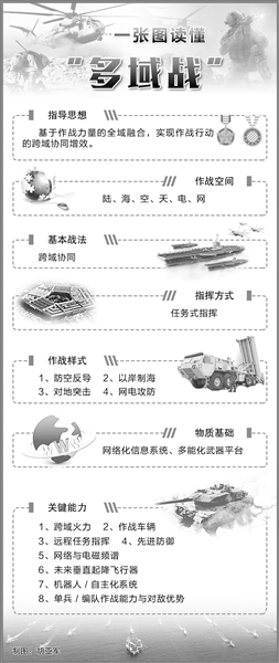 按照美军定义,“多域战”指打破军种、领域之间的界限,各军种在陆、海、空、天、电及网络等领域拓展能力,以实现同步跨域火力和全域机动,夺取物理域、认知域以及时间方面的优势。2016年11月11日,“多域战”概念被正式写入新颁布的美陆军新版作战条令,“作为联合部队的一部分,陆军通过开展‘多域战’,获取、掌控或剥夺敌方力量控制权。陆军将威慑敌方,限制敌方的行动自由,确保联合部队指挥官在多个作战域内的机动和行动自由”。