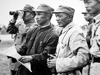 孟良崮战役打响前,陈毅(左一)、粟裕(左二)在前线视察。