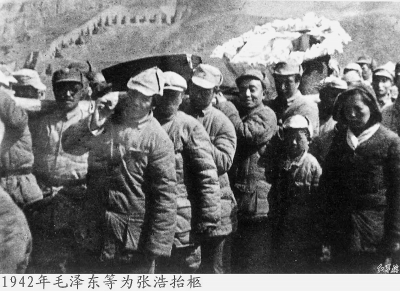 一九四二年三月九日,毛泽东等把林育英的棺柩抬到安葬地。