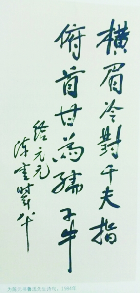 陈云非常喜欢鲁迅的“横眉冷对千夫指,俯首甘为孺子牛”,这句诗成为他秉持的人生信条。他在担任中央纪律检查委员会第一书记时手书了这句诗。