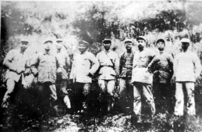 1933年11月,第五次反“围剿”期间,周恩来与部分红军指挥员于建宁前线合影(左起:叶剑英、杨尚昆、彭德怀、刘伯坚、张纯清、李克农、周恩来、滕代远、袁国平)