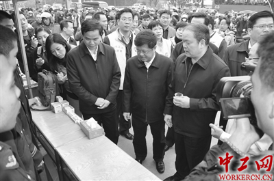 2014年春节前夕,广东省人大常委会副主任、省总工会主席黄业斌,广东省总工会常务副主席陈宗文在“暖流行动”服务现场视察
