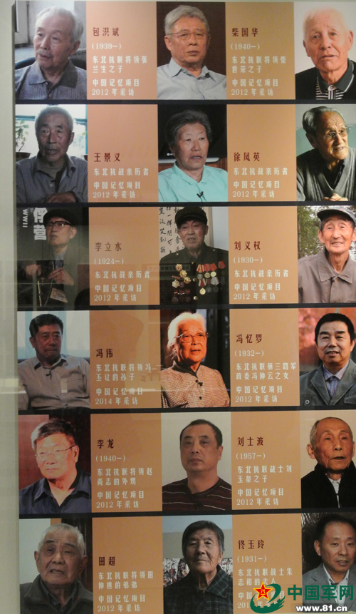 “中国记忆·东北抗日联军”项目对近20位抗联老战士和抗联子女进行了抢救性的口述史访问,获得了珍贵的第一手口述活资料。该项目成果丰硕,并作为此次展览的重要组成部分公开展出。图为“东北抗联老战士”主题展板。记者 黄杨海摄
