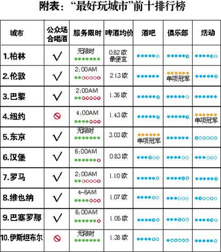 伦敦虽然集最佳俱乐部、音乐会、博物馆、运动中心和酒吧于一身,但其啤酒价格几乎是所有城市中最高的,因此对游客的吸引力大为减少。曼谷在提供成人娱乐服务表现卓越排名第一,其次是东京和纽约。
