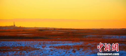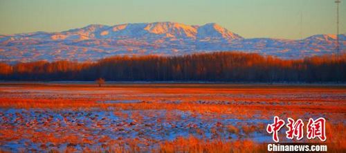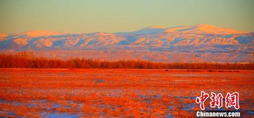 13日,新疆哈巴河县阿克齐湿地,只见远处雪山辉映,近处枯草如金,特别是在旭日和夕阳的照射下,使这里呈现出金银交融美如仙境风景。 (刘是何)