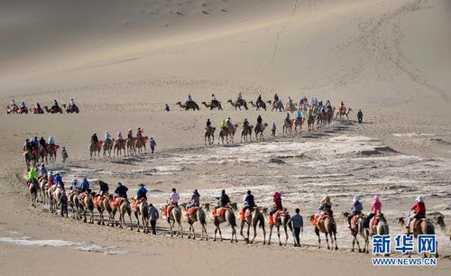 2014年7月11日,游客骑骆驼游览敦煌鸣沙山景区。