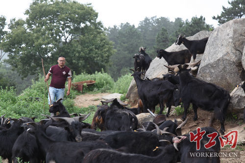 7月20日,山东省临沂市平邑县地方镇东石井村回村大学生刘敬松在海拔700米的鱼鳞山放养蒙山黑山羊。