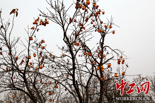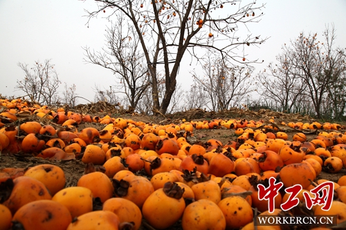 自今年10月上旬平邑县3000亩柿子成熟上市以来,平邑柿子价格从一市斤0.8元骤降至0.3元,且销路不畅,除去人工费卖完柿子几乎不剩钱,种植户因价低干脆不再采收,致使成熟的柿子挂在树上没人采摘,落满一地无人理睬。(武纪全 文/摄)