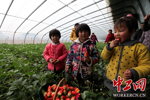春节假期以来,在山东省平邑县烈庄村草莓种植户杜国防的有机草莓大棚里,高品质的有机草莓吸引游客漫步田间,亲自动手采摘,呼吸乡土气息,体验采摘乐趣,享受快乐时光,既乐了游客,更富了农家。近年来,平邑县烈庄村积极引进发展优质“甜宝”草莓种植面积200多亩,全部采用蜜蜂授粉、病虫害绿色防控、生物有机肥和配方施肥等无公害生产技术,所种植的草莓品质高、口感好,亩增加农民收入2万元。图一至图三:游人在山东省平邑县烈庄村草莓种植户杜国防的大棚里采摘有机草莓。图四:杜国防和妻子展示种植的优质有机草莓。(武纪全 摄/文)