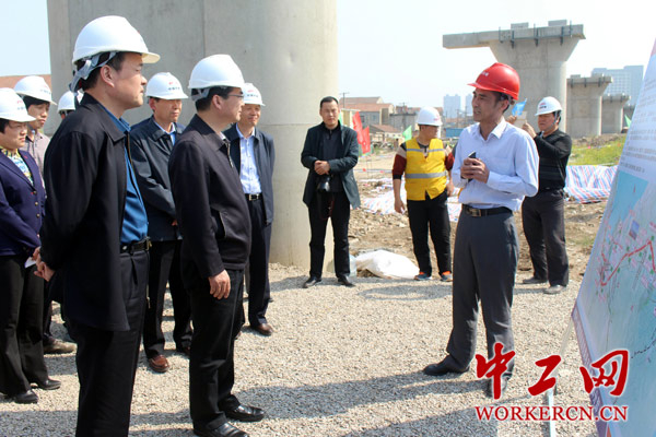 中工网讯 2017年4月28日下午,江苏省连云港市市委书记、市人大常委会主任杨省世,市委常委、市委秘书长王东升,副市长尹哲强,市政府副秘书长王友君,在苏北公司副总经理张林辉、局指挥部经理封明君和项目经理张继军的陪同下,调研中铁十一局三公司连盐铺架工程进展情况。