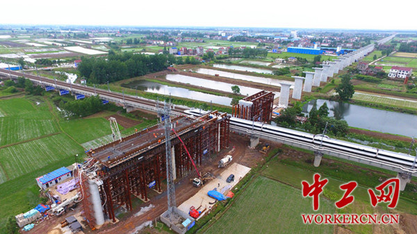跨汉宜高铁特大桥顶推梁段混凝土浇筑的胜利完成,标志着蒙华铁路项目部跨汉宜高铁特大桥施工取得突破性进展,为6月下旬梁体顶推施工创造了条件。(高晶、黄春欣)