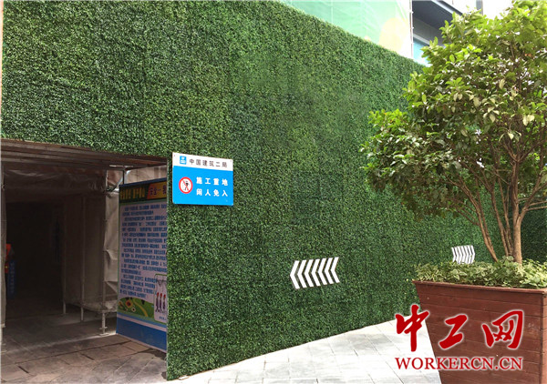 项目所采用的绿色围挡高4米,面积近2000平米,由仿真绿叶和鲜花构成,造型新颖,颜色清新,其可移动的特点让围挡可循环使用,使用率高达70%,围挡上的中建标识在“绿植”陪衬下更为夺目。
