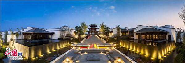 【点睛】没想到粉墙黛瓦的民居小屋,清新幽雅的青山小河,整洁恬淡的村庄小院,原可以存在于山水,令游人常住其中,尽享天人合一、物我两亲的乐趣;天容廖廓,云物鲜华,风景皆入画,人在画中居。这一派徽式淳朴简洁、惬意安宁的别墅,就是隐匿于徽州屯溪山水之间的黄山雨润涵月楼酒店。初见涵月楼,必定是寻仙访道的事情,一路静谧深邃,曲径通幽,到了楼前,忽又豁然开朗,让人忍不住感叹,呵, 原来真是一片风水宝地。徽式的大门楼层层掩映,拾级而上,视野由大变小,又由小变大,恍然间一座半月形小桥、一座更高处宁静的古塔端端的浮现在你眼前,大观园的恢弘大气中又带着些江南水乡的氤氲气息。
