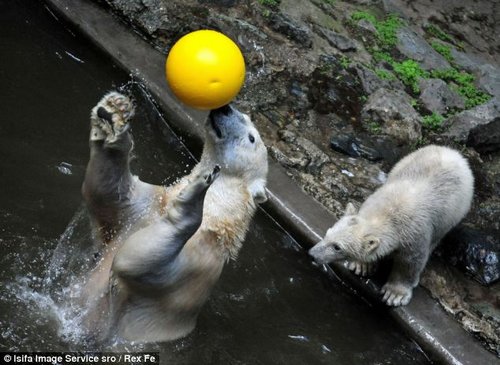 看着妈妈顶球,站在水池旁观看的北极熊幼仔们也一个个伸长了脖子,跃跃欲试,也想体验一下颠球的感觉。一等到妈妈结束了表演把皮球丢在水里后,它们就迫不及待地伸出爪子去捞皮球。