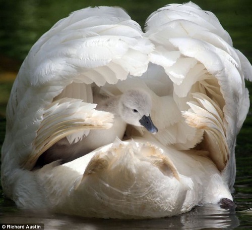 天鹅妈妈也对自己的小宝宝呵护备至,它支起翅膀,给天鹅宝宝搭出一个“小棚子”。小天鹅就在这温暖而安全的“天鹅船”中悠然自得,享受春日阳光。