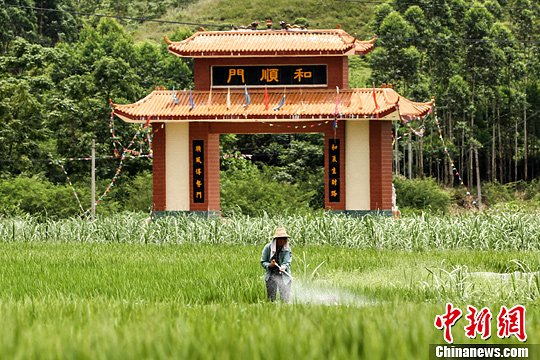 6月7日,广西上林,一名农妇在打理庄稼,其身后是一座由淘金客捐资20余万元人民币修建的村庄大门。中新社发 方冰冰 摄