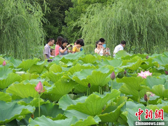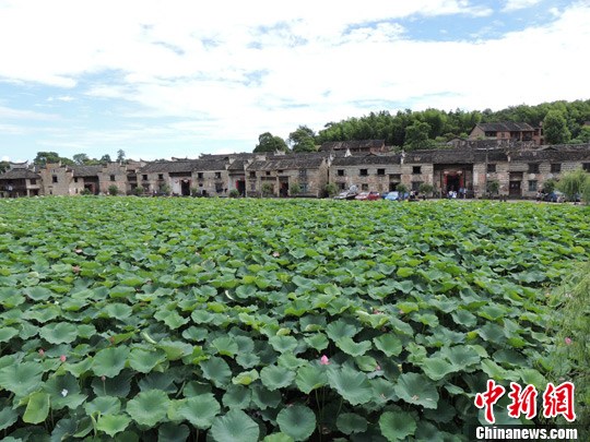 6月17日,湖南省资兴市三都镇三都村流华湾古村荷花含苞待放,吸引不少游客前来赏花观景,组成一幅“一缕芳香飘天际,引来众客赏红莲”的天然场景。张毅 摄