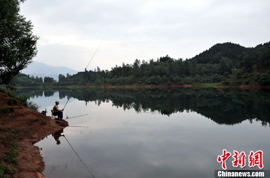 7月11日,仲夏时节,北京密云水库岸边,一位垂钓者在山水交融、郁郁葱葱的美景中,悠闲自得,坐等鱼儿上钩。中新社发 孙自法 摄