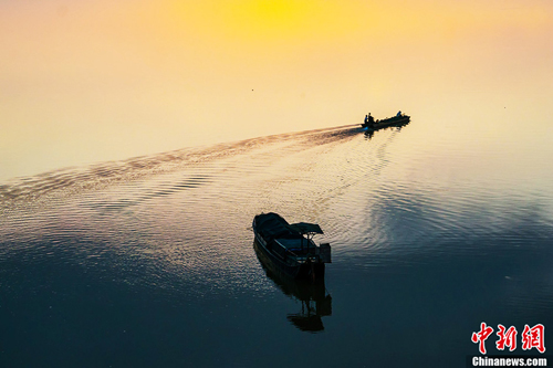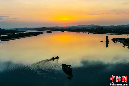 2013年8月1日,广西钦州,晨曦将钦江渲染成橘黄色,显得格外美丽。李斌喜 摄