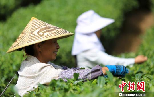 8月8日,两名瑶族妇女在广西柳州市融安县板榄镇东岭村茶园里采摘茶叶。 谭凯兴 摄