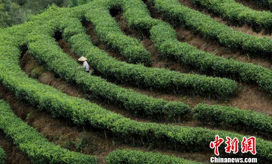 8月8日,一名瑶族妇女在广西柳州市融安县板榄镇东岭村茶园里采摘茶叶。 谭凯兴 摄