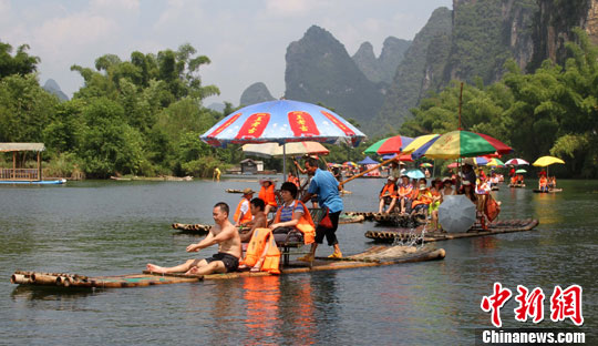 进入8月份以来,每天都有上万名游客慕名到阳朔遇龙河乘坐竹筏漂流。中新社发 贺振敏 摄