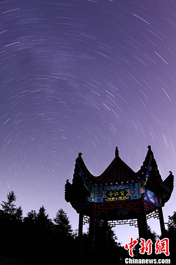 2013年8月13日凌晨在江西省万载县龙山公园用长时间曝光拍摄的龙山与星轨 。邓龙华 摄