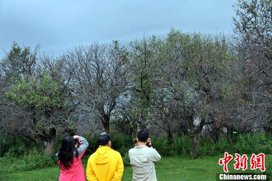 8月14日,新疆伊犁新源县4万多亩野果林中野苹果挂满枝头,但受虫害影响较重亟需解决。中新社发 孙自法 摄