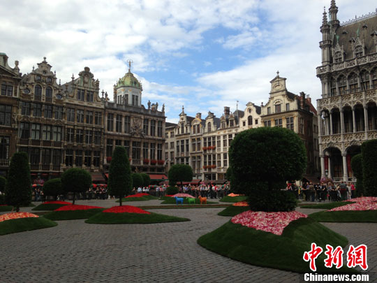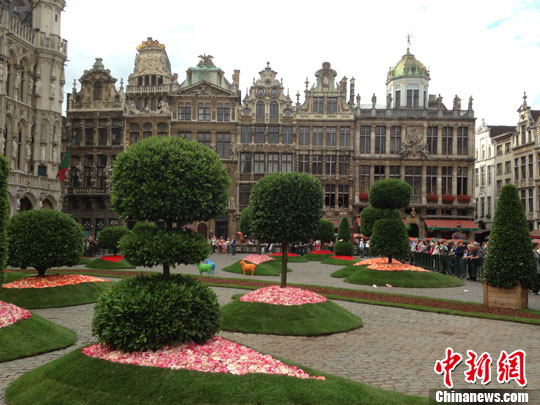 8月15日,布鲁塞尔首届市政厅花艺展览在市中心大广场开幕,预计将吸引数万名游客。中新社发 沈晨 摄