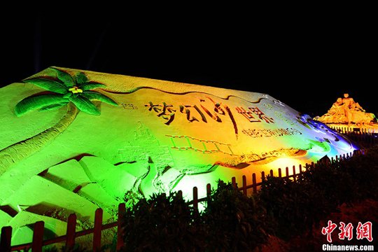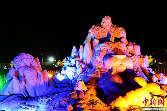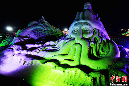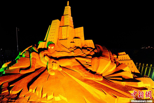 8月20日,福建平潭龙凤头海滨浴场以“梦幻沙世界”为主题的沙雕园内,《指环王》、《阿凡达》、《超凡蜘蛛侠》、《加勒比海盗》等很受年轻人和孩子们喜欢的电影为创作主题的影视沙雕作品集体亮相,沙雕作品采用组合沙雕与单体沙雕相结合,主沙雕为彩雕形式,夜幕下沙雕在各色灯光的映衬下,让游客如同走进梦幻中的世界。张斌 摄